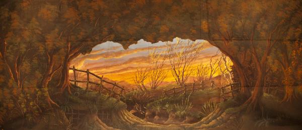Scenografia composta da un fondale e due principali. Supporto in carta siling avana extra da 80 g. al mq. dipinto con colori a terra uniti con leganti vinilici e fortezzato con strisce in tela di cotone di diverse grammature lungo i bordi perimetrali e lungo le linee di piegatura.