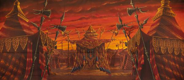 Scenografia composta da un fondale e due principali. Supporto in carta siling avana extra da 80 g. al mq. dipinto con colori a terra uniti con leganti vinilici e fortezzato con strisce in tela di cotone di diverse grammature lungo i bordi perimetrali e lungo le linee di piegatura.