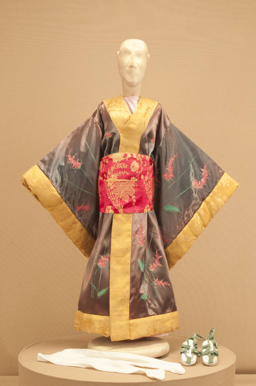Costume da geisha composto da kimono, veste, obi, calze e sandali.