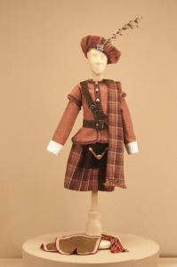 Costume scozzese per militare di foggia seicentesca composto da kilt, giacca, sciarpa, cintura, bandoliera, cappello, uose, finte calze.