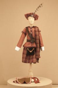 Costume scozzese per militare di foggia seicentesca composto da kilt, giacca, sciarpa, cintura, bandoliera, cappello, uose, finte calze.