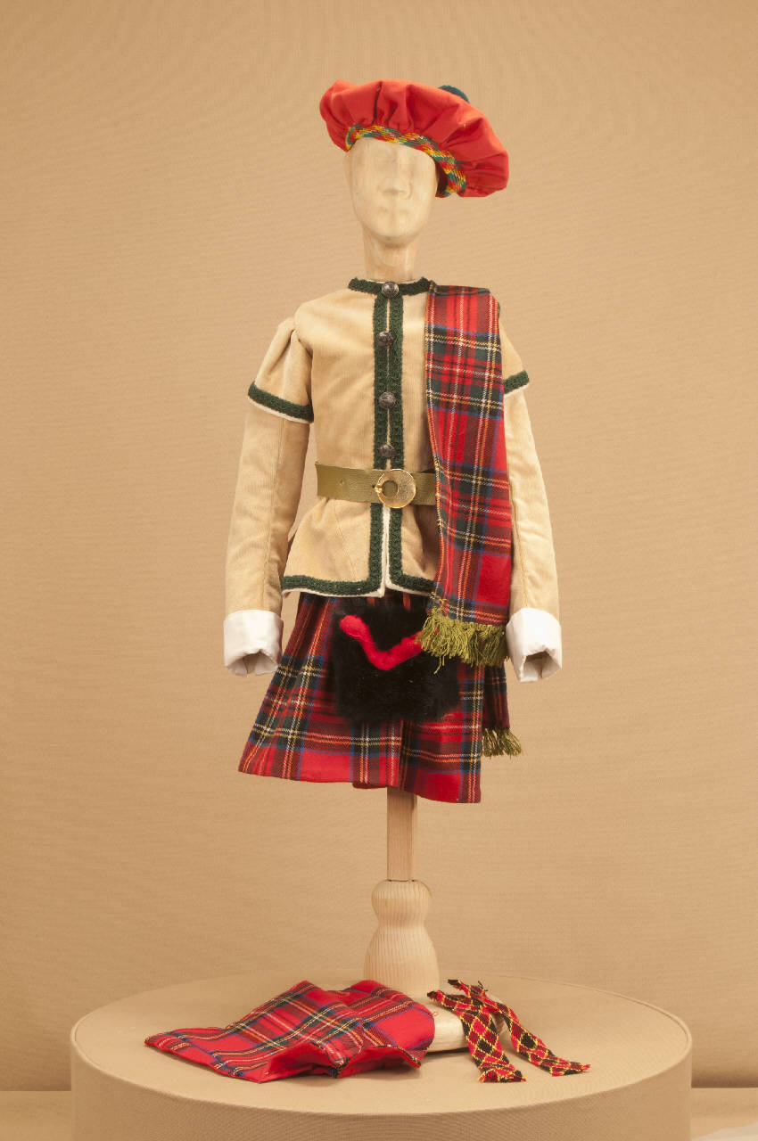Costume scozzese di foggia seicentesca composto da kilt, giacca, sciarpa, cintura, cappello, uose, finte calze.