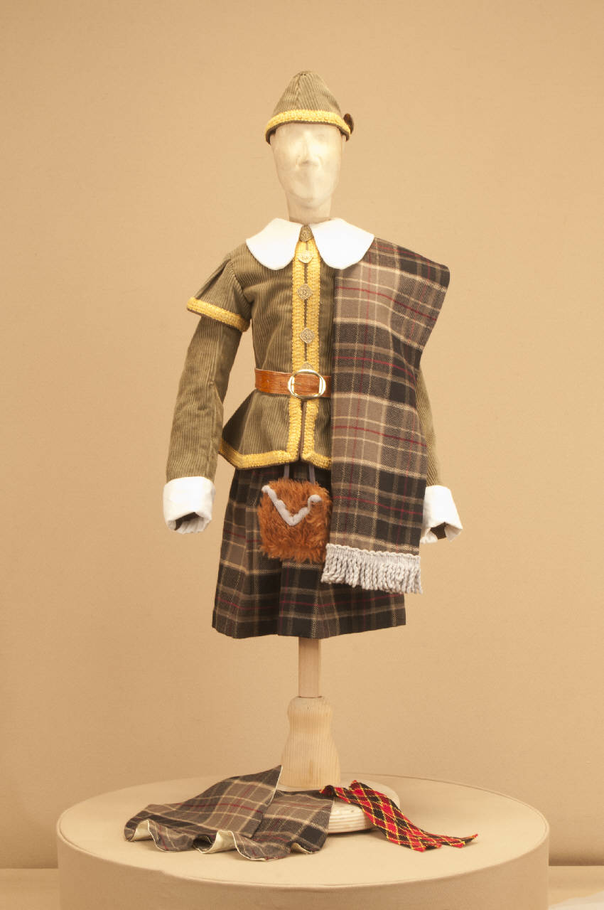 Costume scozzese di foggia seicentesca composto da kilt, giacca, sciarpa, cintura, cappello, collo, uose, finte calze.