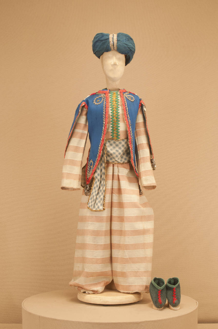Costume militare di foggia orientale composto da pantaloni, corpino, bolero, fascia, scarpe e turbante.