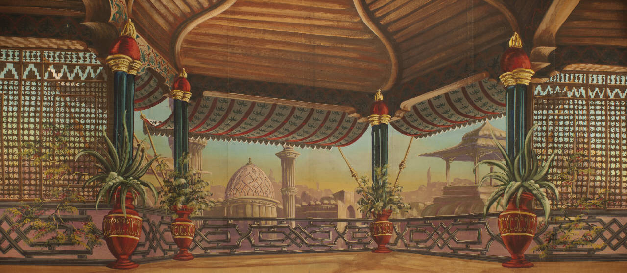 - NOTIZIE STORICO CRITICHE La scenografia è stata realizzata in occasione del ri-allestimento dello spettacolo nel 1998. Al Teatro Gerolamo di Milano, sede stabile della Compagnia Carlo Colla e Figli dal 1906 al 1957, "Il giro del mondo in 80 giorni" è sempre stato uno dei titoli più rappresentati sino al 1938, anno in cui, a causa delle leggi razziali, il regime ne proibì la rappresentazione poiché il romanzo termina con il matrimonio tra il protagonista, l'europeo Phileas Fogg, e l'indiana Auda. Insieme al "Ballo Excelsior" e al "Cristoforo Colombo", l'adattamento dello scritto di Jules Verne costituisce, nel repertorio della compagnia, la triade inneggiante alla vittoria del progresso e del tecnicismo. La vecchia edizione di Carlo II Colla era stata concepita nel 1897 con criterio estremamente realistico, tant'è che il personaggio di Passepartout era stato sostituito dall'autore con quello della maschera di Gerolamo seguendo una concezione popolare. La nuova edizione, presentata in prima assoluta al 35° Festival dei Due Mondi di Spoleto nel 1992, con musiche originali di repertorio adattate dal maestro Danilo Lorenzini, tende a risolvere in chiave più ironica l'incredibile viaggio e ripristina l¿originale personaggio di Passepartout. Nel 1998 il materiale antico è stato completamente sostituito con nuovi costumi, nuove marionette e nuovi materiali di attrezzeria e scenografia. Lo spettacolo è stato portato in tournè in tutta Europa, in America (Festival di Charleston, 2000) e in Australia (2001).