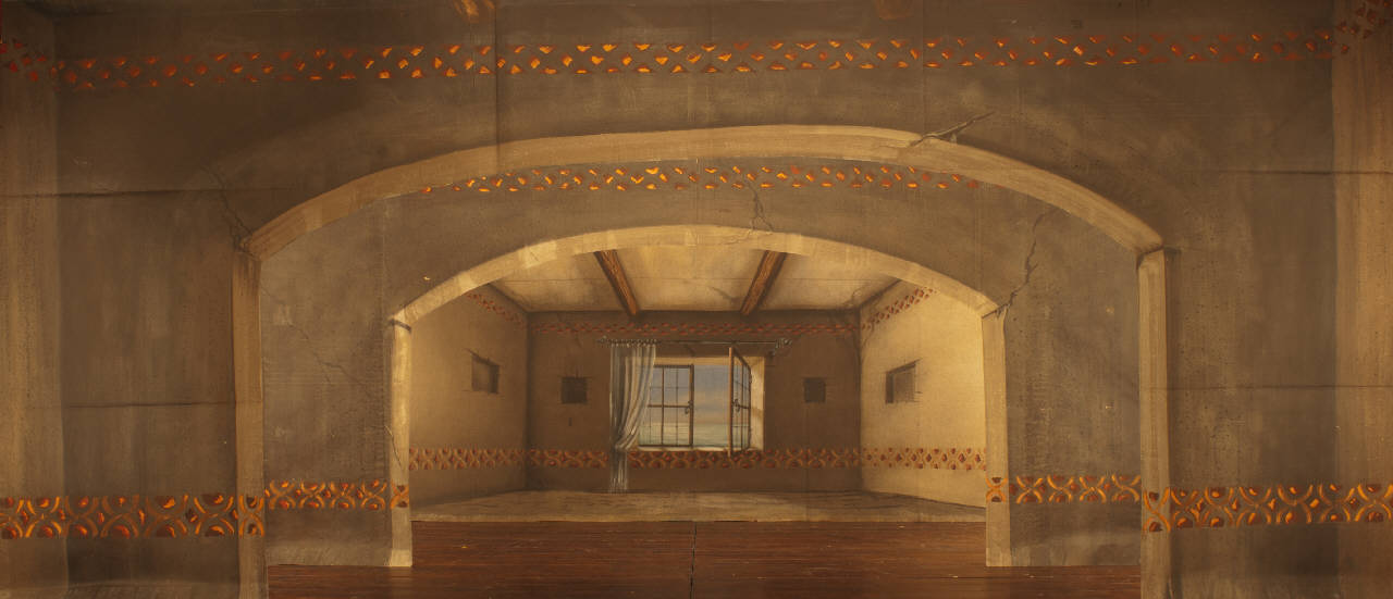 Scenografia composta da un fondale e due principali. Supporto in carta siling avana extra da 80 g. al mq. dipinto con colori a terra uniti con leganti vinilici e fortezzato con strisce in tela di cotone di diverse grammature lungo i bordi perimetrali e lungo le linee di piegatura. Fondale dipinto su tulle super gobelin bianco 90g mq di cotone confezionato con tela e fettuccia.