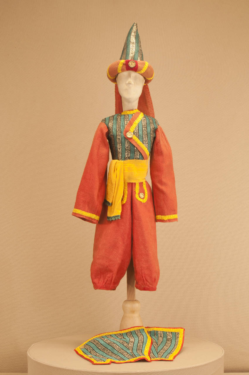 - NOTIZIE STORICO CRITICHE Lo spettacolo "Gerolamo schiavo in Algeri" fu rappresentato per la prima volta al Teatro Gerolamo nel 1933, utilizzando alcuni costumi preesistenti: lo si nota dalla foggia e dai materiali impiegati risalenti, con molta probabilità, alla seconda metà dell¿Ottocento. Potrebbe trattarsi di materiale proveniente dall¿edificio di Antonio Colla. Alcune parti del costume sono state rifatte da Eugenio Monti Colla nel 1989 per il debutto all¿Hebbel Theatre di Berlino dello spettacolo "Le mille e una notte", mantenendo le fodere originarie e, per il cappello, il turbante: il costume era usato per il personaggio della guardia.