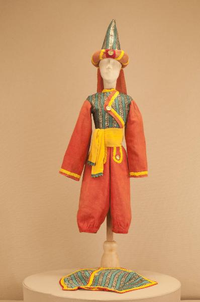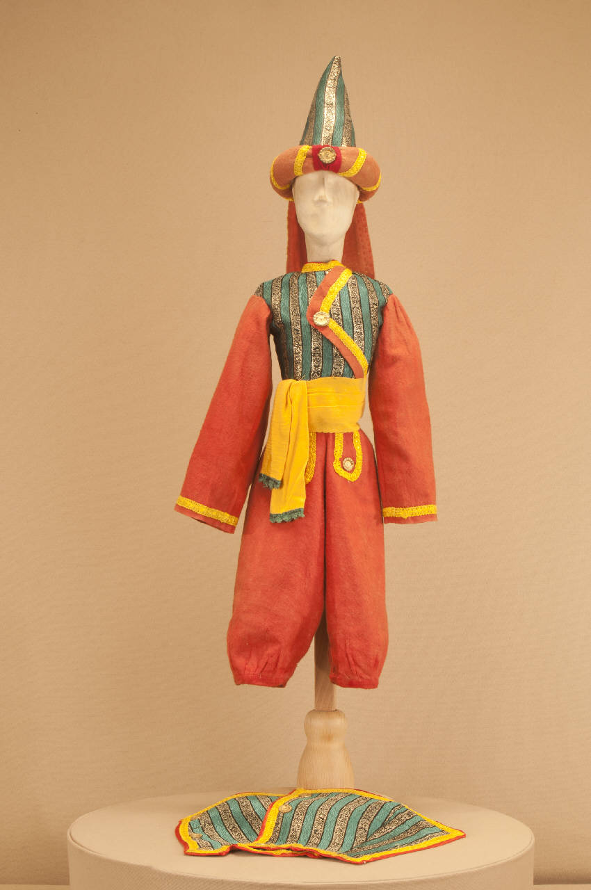 - NOTIZIE STORICO CRITICHE Lo spettacolo "Gerolamo schiavo in Algeri" fu rappresentato per la prima volta al Teatro Gerolamo nel 1933, utilizzando alcuni costumi preesistenti: lo si nota dalla foggia e dai materiali impiegati risalenti, con molta probabilità, alla seconda metà dell¿Ottocento. Potrebbe trattarsi di materiale proveniente dall¿edificio di Antonio Colla. Alcune parti del costume sono state rifatte da Eugenio Monti Colla nel 1989 per il debutto all¿Hebbel Theatre di Berlino dello spettacolo "Le mille e una notte", mantenendo le fodere originarie e, per il cappello, il turbante: il costume era usato per il personaggio della guardia.