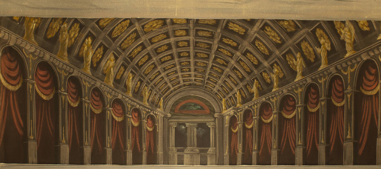 - NOTIZIE STORICO CRITICHE La scenografia è stata realizzata in occasione del riallestimento dello spettacolo nel 1998. "Il Vescovo Ambrogio di Milano" è la nuova scritturazione da parte di Eugenio Monti Colla, di un antico manoscritto composto da Luigi Lupi per la vedova Fiando e passato poi per acquisto alla Compagnia Carlo Colla e Figli. Compare nel repertorio della Compagnia di Fiando al Teatro Gerolamo di Milano dalla stagione 1874/1875 con il titolo "L¿imperatore Teodosio e il Vescovo Ambrogio di Milano". Entrambe i testi, narrando intrighi e vicende, pongono una particolare attenzione alla contrapposizione politico religiosa fra la cultura dell¿antica Roma e l¿affermazione del Cristianesimo sottolineando le controversie che cominciavano a profilarsi fra il potere temporale e quello spirituale ed il dissidio politico dopo l¿unificazione fra l¿Impero d¿Oriente e quello d¿Occidente. Il copione, mai ripreso nel `900 dalla Compagnia Carlo Colla e Figli, è stato allestito nella nuova versione, nel 1998 utilizzando gran parte del materiale storico ed è andato in scena il 7 dicembre al Piccolo Teatro Grassi di Milano con le musiche originali del maestro Danilo Lorenzini. Lo spettacolo fu replicato per una settimana sia per il pubblico delle scuole che per quello serale con una serie di esauriti. L¿allestimento è stato una parte del progetto triennale dal titolo "Incontro al Giubileo" che unitamente agli spettacoli "I promessi sposi" e "La Capanna di Betlemme" prevedeva tre appuntamenti a partire dal 1998, di avvicinamento al 2000.