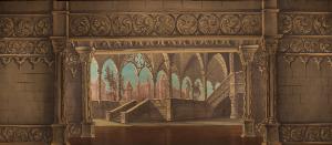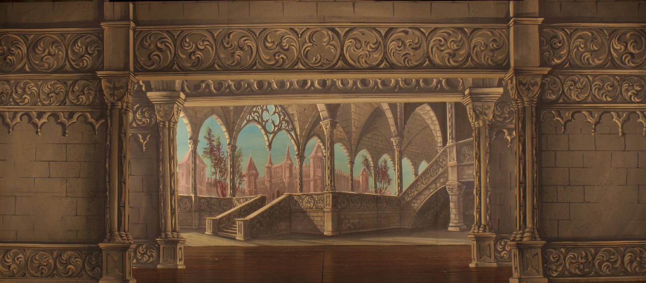 Scenografia composta da un solo fondale e due principali. Supporto in carta siling avana extra da 80 g. al mq. dipinto con colori a terra uniti con leganti vinilici. Fortezzature ribattute con strisce in tela di cotone di diverse grammature lungo i bordi perimetrali e lungo le linee di piegatura.