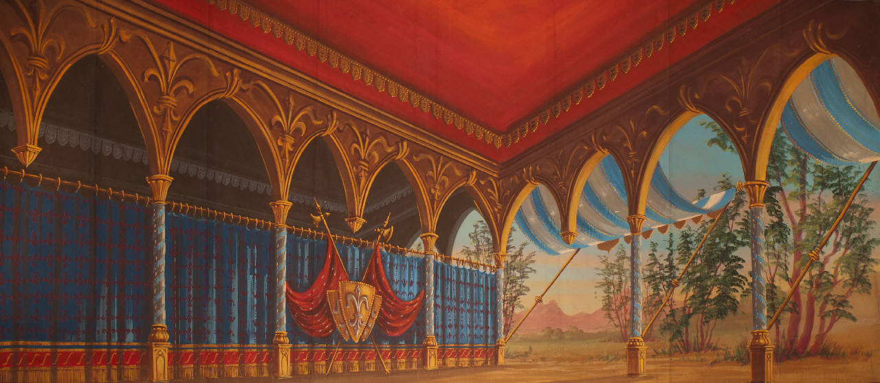Scenografia composta da un solo fondale. Supporto in carta siling avana extra da 80 g. al mq. dipinto con colori a terra uniti con leganti vinilici. Fortezzature ribattute con strisce in tela di cotone di diverse grammature lungo i bordi perimetrali e lungo le linee di piegatura.