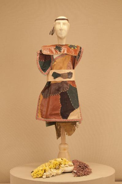 - NOTIZIE STORICO CRITICHE Il costume si completa con un paio di calzature in stile. Lo spettacolo "La leggenda di Pocahontas" andò in scena per la prima volta al "Spoleto Festival USA" di Charleston nel 1989, su precisa richiesta degli spettatori che chiedevano ai Colla uno spettacolo sulla loro epopea. Si trattava di un¿azione mimica su soggetto di Elisabetta Di Mambro ed Eugenio Monti con scene di Pierluigi Bottazzi e costumi di Maurizio Dotti. Le musiche di Alfredo Lacosegliaz ripetevano temi folcloristici antichi delle popolazioni indiane mescolati a motivi di musica europea dell¿età barocca. Nel 1996 Eugenio Monti riscrisse lo spettacolo, trasformandolo in azione drammaturgica, affidando la parte musicale a Danilo Lorenzini e la parte scenografica a Franco Citterio. Vennero rifatti numerosi costumi, su ideazione di Eugenio Monti Colla.