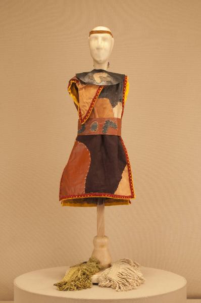 - NOTIZIE STORICO CRITICHE Il costume si completa con un paio di calzature in stile. Lo spettacolo "La leggenda di Pocahontas" andò in scena per la prima volta al "Spoleto Festival USA" di Charleston nel 1989, su precisa richiesta degli spettatori che chiedevano ai Colla uno spettacolo sulla loro epopea. Si trattava di un¿azione mimica su soggetto di Elisabetta Di Mambro ed Eugenio Monti con scene di Pierluigi Bottazzi e costumi di Maurizio Dotti. Le musiche di Alfredo Lacosegliaz ripetevano temi folcloristici antichi delle popolazioni indiane mescolati a motivi di musica europea dell¿età barocca. Nel 1996 Eugenio Monti riscrisse lo spettacolo, trasformandolo in azione drammaturgica, affidando la parte musicale a Danilo Lorenzini e la parte scenografica a Franco Citterio. Vennero rifatti numerosi costumi, su ideazione di Eugenio Monti Colla.