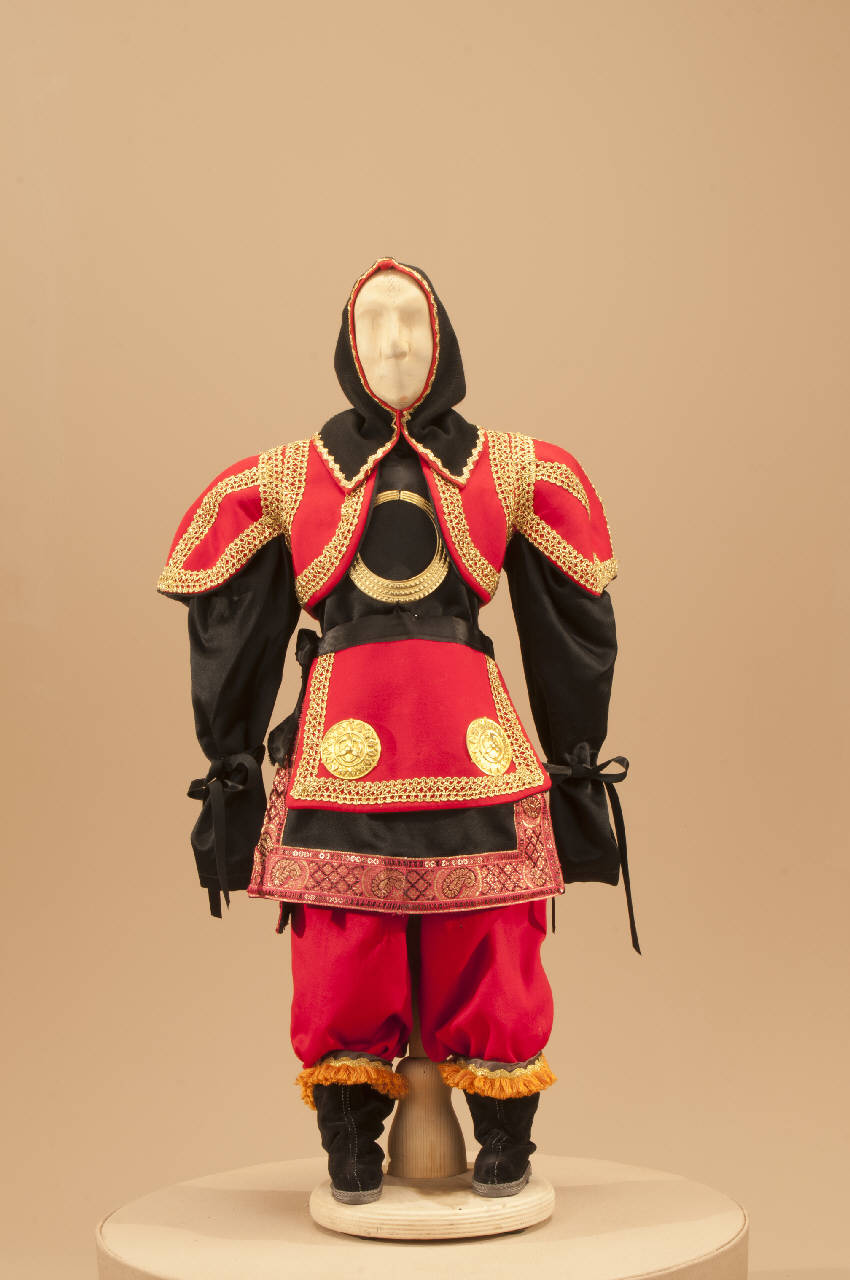 Costume cinese composto da pantaloni, veste ,bolero, cintura e cuffia.