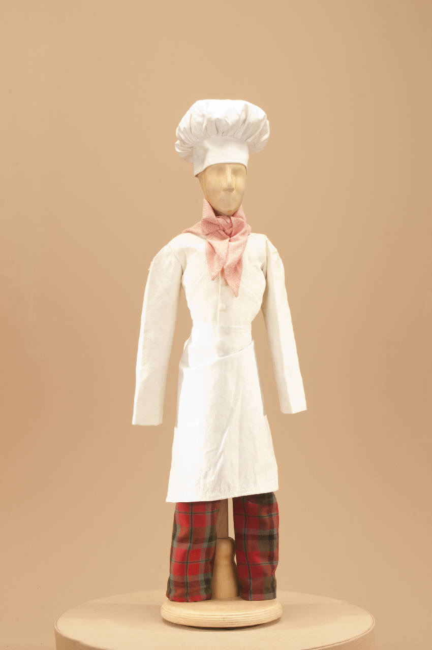 Costume da cuoco composto da pantaloni, giacca,grembiule,fazzoletto da collo e cappello.