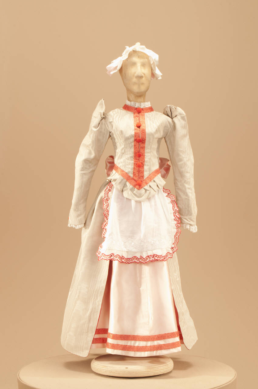 Costume da cameriera composto da gonna, corpino, cuffia e fiocco.