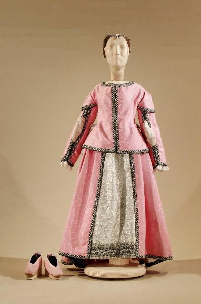 Costume per dama del 1600, composto da gonna, corpino, cuffietta, scarpe