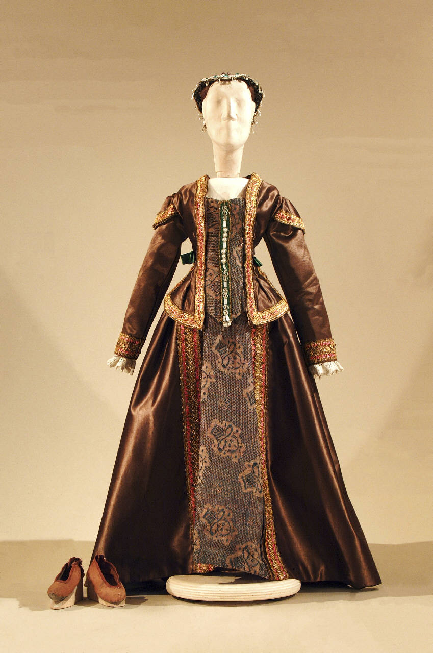 Costume per dama del 1600, composto da gonna, corpino, cuffietta, scarpe