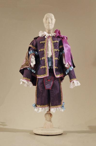 Costume per cavaliere del 1600 composto da pantaloni, giacca, camicia, cintura con borsetta, mantellina, nastro con fiocco