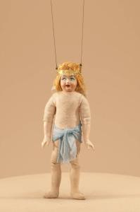 Testa, mani e piedi in pasta gessosa fissati al corpo tramite chiodini e cuciture. Corpo in tela imbottita di stoppa. Rivestimento in maglina di cotone. Cintola di nastro azzurro e fascia dorata alla fronte. Capelli sintetici.