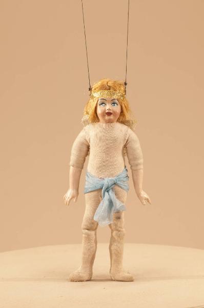 Testa, mani e piedi in pasta gessosa fissati al corpo tramite chiodini e cuciture. Corpo in tela imbottita di stoppa. Rivestimento in maglina di cotone. Cintola di nastro azzurro e fascia dorata alla fronte. Capelli sintetici.
