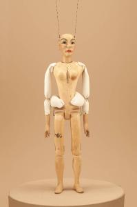 Testa di legno di tiglio fissata al corpo tramite ferro. Corpo piccolo in tiglio. Gambe raccordate al bacino tramite bordione in ferro, ginocchia ad incastro mobile. Mani in tiglio con dita scolpite e separate. Bilancino a croce per coppie.