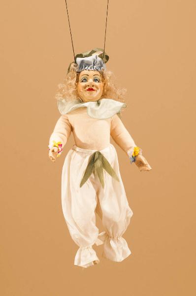 - NOTIZIE STORICO CRITICHE Questo figurino compariva, scendendo dall'alto, in una ghirlanda fiorita insieme ad altri 11 figurini simili, uniti fra loro da una corda colorata. Lo spettacolo "La Tempesta" fu commissionato dalla Biennale di Venezia nella persona di Franco Quadri, direttore del Settore Teatro, nel 1985. Eduardo De Filippo volle che ad interpretarlo fossero le marionette. Lo spettacolo, andato in scena un anno dopo la sua morte al Teatro Goldoni di Venezia, fu curato per la parte registrata, con la voce del celebre attore, dal figlio Luca De Filippo; per i costumi furono creati bozzetti da Maurizio Dotti, modificati in corso di allestimento da Eugenio Monti Colla; le scenografie furono affidate a Pierluigi Bottazzi, Maurizio Dotti e Riccardo Di Lauro. La musica fu composta e diretta dal maestro Antonio Sinagra, compositore di fiducia dalla famiglia De Filippo. Nella ripresa del 2013 furono realizzate nuove scenografie da Franco Citterio e alcuni nuovi elementi scenici e marionettistici.