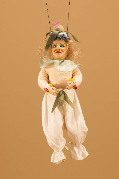 - NOTIZIE STORICO CRITICHE Questo figurino compariva, scendendo dall'alto, in una ghirlanda fiorita insieme ad altri 11 figurini simili, uniti fra loro da una corda colorata. Lo spettacolo "La Tempesta" fu commissionato dalla Biennale di Venezia nella persona di Franco Quadri, direttore del Settore Teatro, nel 1985. Eduardo De Filippo volle che ad interpretarlo fossero le marionette. Lo spettacolo, andato in scena un anno dopo la sua morte al Teatro Goldoni di Venezia, fu curato per la parte registrata, con la voce del celebre attore, dal figlio Luca De Filippo; per i costumi furono creati bozzetti da Maurizio Dotti, modificati in corso di allestimento da Eugenio Monti Colla; le scenografie furono affidate a Pierluigi Bottazzi, Maurizio Dotti e Riccardo Di Lauro. La musica fu composta e diretta dal maestro Antonio Sinagra, compositore di fiducia dalla famiglia De Filippo. Nella ripresa del 2013 furono realizzate nuove scenografie da Franco Citterio e alcuni nuovi elementi scenici e marionettistici.