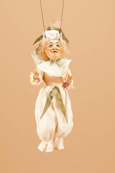 - NOTIZIE STORICO CRITICHE Questo figurino compariva, scendendo dall'alto, in una ghirlanda fiorita insieme ad altri 11 figurini simili, uniti fra loro da una corda colorata. Lo spettacolo "La Tempesta" fu commissionato dalla Biennale di Venezia nella persona di Franco Quadri, direttore del Settore Teatro, nel 1985. Eduardo De Filippo volle che ad interpretarlo fossero le marionette. Lo spettacolo, andato in scena un anno dopo la sua morte al Teatro Goldoni di Venezia, fu curato per la parte registrata, con la voce del celebre attore, dal figlio Luca De Filippo; per i costumi furono creati bozzetti da Maurizio Dotti, modificati in corso di allestimento da Eugenio Monti Colla; le scenografie furono affidate a Pierluigi Bottazzi, Maurizio Dotti e Riccardo Di Lauro. La musica fu composta e diretta dal maestro Antonio Sinagra, compositore di fiducia dalla famiglia De Filippo. Nella ripresa del 2013 furono realizzate nuove scenografie da Franco Citterio e alcuni nuovi elementi scenici e marionettistici.