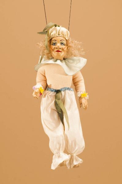 - NOTIZIE STORICO CRITICHE Questo figurino compariva, scendendo dall'alto, in una ghirlanda fiorita insieme ad altri 11 figurini simili, uniti fra loro da una corda colorata. Lo spettacolo "La Tempesta" fu commissionato dalla Biennale di Venezia nella persona di Franco Quadri, direttore del Settore Teatro, nel 1985. Eduardo De Filippo volle che ad interpretarlo fossero le marionette. Lo spettacolo, andato in scena un anno dopo la sua morte al Teatro Goldoni di Venezia, fu curato per la parte registrata, con la voce del celebre attore, dal figlio Luca De Filippo; per i costumi furono creati bozzetti da Maurizio Dotti, modificati in corso di allestimento da Eugenio Monti Colla; le scenografie furono affidate a Pierluigi Bottazzi, Maurizio Dotti e Riccardo Di Lauro. La musica fu composta e diretta dal maestro Antonio Sinagra, compositore di fiducia dalla famiglia De Filippo. Nella ripresa del 2013 furono realizzate nuove scenografie da Franco Citterio e alcuni nuovi elementi scenici e marionettistici.
