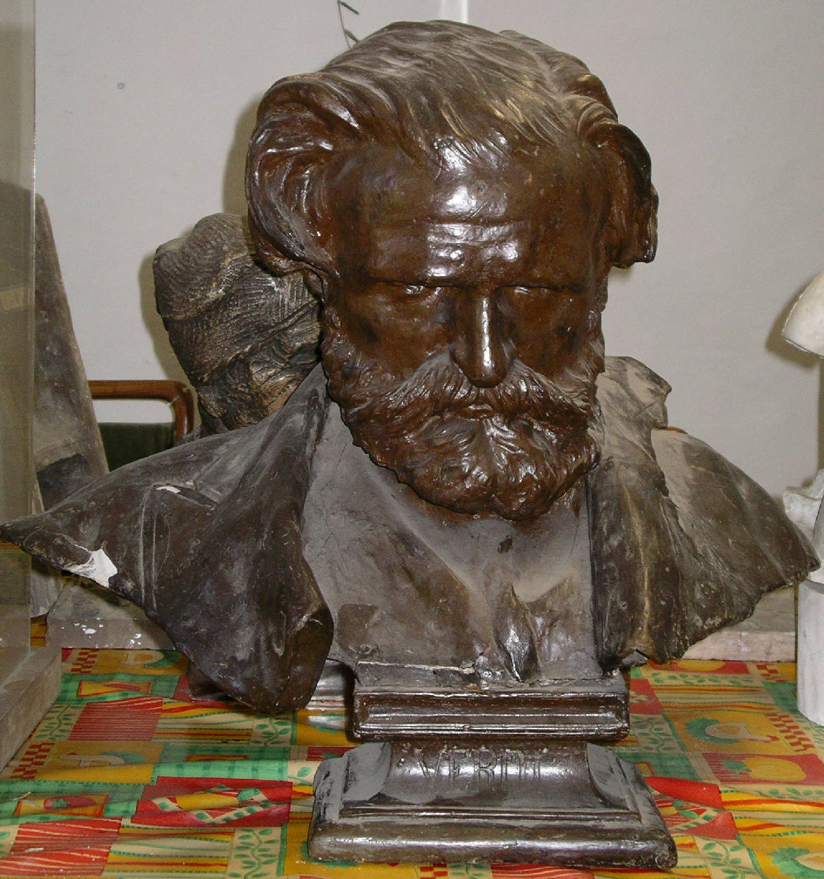 - NOTIZIE STORICO CRITICHE Si tratta di una copia novecentesca del più famoso busto in bronzo di Giuseppe Verdi, realizzato nel 1874 dallo scultore napoletano Vincenzo Gemito e conservato al Museo Teatrale alla Scala di Milano. Altri esemplari in bronzo, i più conosciuti della prolifica iconografia verdiana, si conservano nella Regia Galleria d'Arte Moderna di Firenze (realizzato nel 1875), nel Museo del Risorgimento "L. Musini" a Fidenza (eseguito a Napoli nel 1872, copia in bronzo della terracotta originale che si trova a S. Agata nella villa Verdi), nella Casa di Riposo dei Musicisti a Milano, nella Collezione del Banco di Napoli e nella Galleria d'Arte Moderna di Roma. Un disegno relativo al "Ritratto di Verdi" è in collezione privata.\nNel 2006 una copia in bronzo dello stesso busto si trovava a Milano Internazionale Antiquariato, dall'antiquario Mottola di Milano.