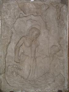 - NOTIZIE STORICO CRITICHE Come vuole la tradizione iconografica, San Girolamo è inginocchiato di tre quarti davanti al Crocifisso. Vestito solo di un manto che copre addome e gambe, si trova davanti all'ingresso di una grotta, al cui interno si vedono il cappello cardinalizio e dei libri, suoi consueti attributi insieme al leone che si scorge in secondo piano.\nProveniente dal mercato antiquario, il rilievo è riferito da A. Bacchi ("Il conoscitore d'arte..., 1989, pp. 16-17) all'ambiente padovano del 1460 ca. L'ipotesi si baserebbe, oltre che sul confronto con opere lasciate da Donatello nella sua attività per la Basilica del Santo, anche dal rapporto con altre eseguite al suo seguito nell'Italia settentrionale. Inoltre, la composizione rispecchierebbe le versioni che dello stesso soggetto realizzarono in quegli anni i più importanti pittori che passarono per Padova, da Andrea Mantegna a Marco Zoppo. Lo stile del rilievo, privo di quegli elementi taglienti nelle figure tipici della scultura padovana dell'ultima parte del XV secolo, consentirebbe di confermare una realizzazione intorno agli anni Sessanta del Quattrocento. Bacchi ipotizza che l'autore possa essere Bartolomeo Bellano, allievo e collaboratore di Donatello sia a Firenze che a Padova, la cui produzione iniziale fu segnata da una totale fedeltà nei confronti del maestro.