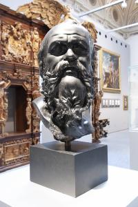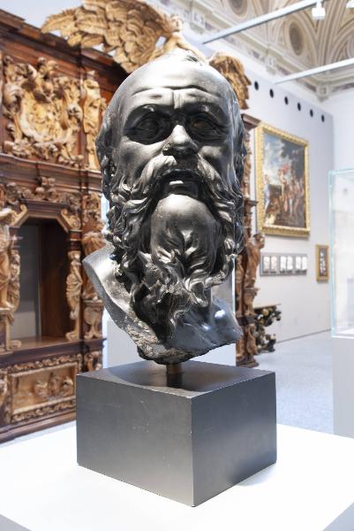 - NOTIZIE STORICO CRITICHE In questo volto girato verso destra caratterizzato da naso largo, ampia fronte con ciuffo di capelli che ricadono lunghi i lati e folta barba che non ricopre il mento prominente, è possibile riconoscere la tradizionale iconografia del filosofo antico Socrate. Lo scarto laterale della testa fa pensare ad una raffigurazione in movimento, forse subordinata ad un'azione (la morte del filosofo, un colloquio con i suoi discepoli o una delle storie con Diotima o la moglie Santippe).\nRitenuta da F. Zeri un'opera romana del XVII secolo, questa testa venne resa noto da A. Bacchi ("La donazione Federico Zeri", 2000, pp. 44-45) come ispirata da un modello antico. La scelta del marmo nero la collega ad un'importante produzione attestata a Roma già nella seconda metà del Cinquecento ma ampiamente documentata presso scultori e restauratori nei primi decenni del secolo successivo. Si pensa possa essere l'esito del completamento di un busto antico, secondo la pratica di restauro prevista dalla bottega dei Della Porta e poi a lungo esercitata durante la nascita delle grandi collezioni di antichità romane del Seicento ("Sculture dalle collezioni Santarelli e Zeri", 2012, pp. 134-135).