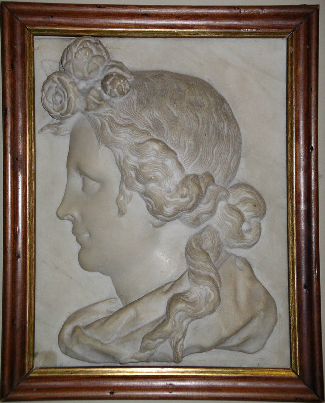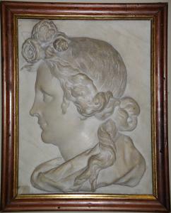 - NOTIZIE STORICO CRITICHE Insieme a "Testa di vecchio di profilo" (num. inv. 98ZR00022), "Testa di vecchia di profilo" (num. inv. 98ZR00023) e "Testa di giovane uomo di profilo" (num. inv. 98ZR00024) conservati anch'essi in Accademia Carrara, questo testa di giovane donna di profilo era originariamente racchiusa da una cornice architettonica. Assegnati prima alla produzione matura del vicentino Orazio Marinali e poi a quella del suo imitatore Giovanni Bonazza, campione indiscusso della produzione scultorea veneta tardo barocca, i quattro rilievi, che mostrano una forte caratterizzazione per "tipi", sono stati recentemente restituiti allo scultore fiammingo Giusto Le Court che li realizzò con ogni probabilità tra il 1670 e il 1679.