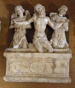 - NOTIZIE STORICO CRITICHE Entrato in Accademia Carrara con il legato Carlo Ceresa del 1924, questo rilievo va ricollegato alla cerchia dello scultore Giovanni Antonio Amadeo, come suggeriscono sia i panneggi con angolature taglienti che le superfici ricche di solcature profonde. La medesima immagine devozionale, che ritrae Cristo morto affiancato da due angeli mentre si erge dal sepolcro vuoto per mostrare le ferite, si ritrova nel registro decorativo del Monumento funebre a Medea Colleoni conservato nella Cappella Colleoni in Bergamo Alta, una delle opere giovanili dell'Amadeo realizzata nei primi anni '70 del Quattrocento.