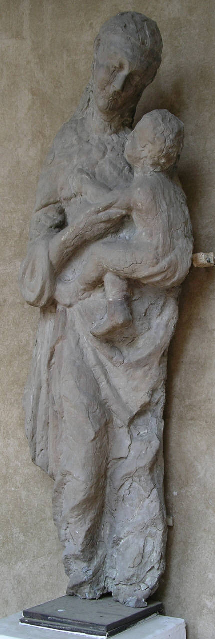 - NOTIZIE STORICO CRITICHE Depositata in Accademia Carrara nel 1990, questa Madonna con il Bambino si trovava originariamente all'interno della lanterna nella Cappella Colleoni di Bergamo. Sostituita, quasi certamente in occasione dei restauri condotti tra il 1988 e il 1995, con una copia tuttora esposta fu successivamente ricoverata presso il palazzo del Luogo Pio Colleoni. L'opera può essere riferita ad uno dei collaboratori di Giovanni Antonio Amadeo, forse a quel Giovanni Antonio Piatti che lavorò in società col maestro pavese negli anni della costruzione della Cappella. Supportano l'ipotesi alcune affinità riscontrate con opere dello scultore come il modo di rendere le vesti, le mani affusolate, la fisionomia del volto della Madonna e gli atteggiamenti affettuosi dei personaggi.