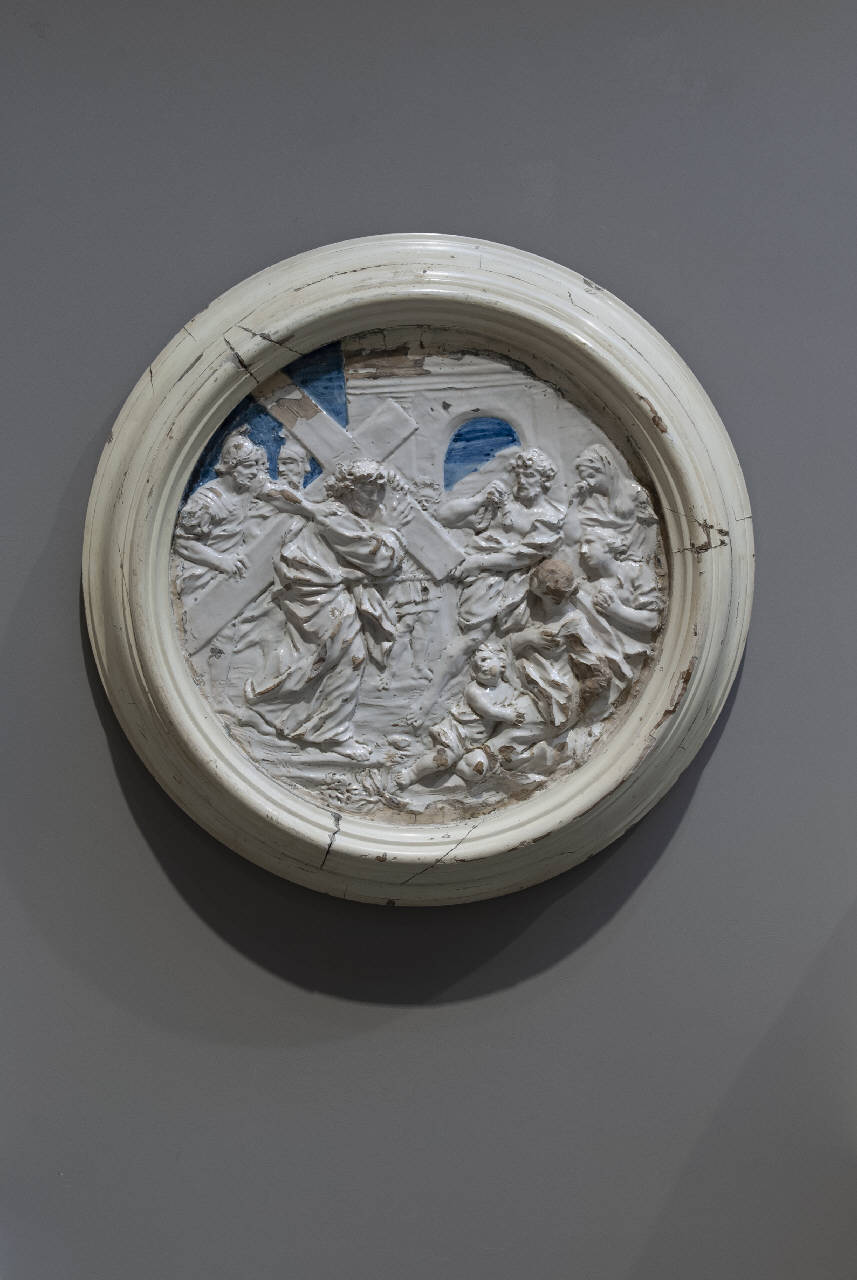 • NOTIZIE STORICO CRITICHE La terracotta raffigura l'ottava stazione della Via Crucis: sulla via al Calvario, Gesù incontra un gruppo di donne di Gerusalemme che piange per lui battendosi il petto, pronunciando lamenti, come in un funerale.\nIl tondo, insieme all'altro in collezione Zeri anch'esso conservato in Accademia Carrara(n. inv. 98ZR00019), faceva parte di una Via Crucis in terracotta invetriata ordinata dal Granduca Cosimo III Medici ai giovani artisti che allora frequentavano a Roma l'Accademia di Belle Arti da lui fondata. Alla serie parteciparono Anton Francesco Andreozzi, Giovan Camillo Cateni, Francesco Ciaminghi e Giuseppe Piamontini. Ciro Ferri avrebbe dovuto sovrintendere all'impresa, fornendo i disegni e seguendo i giovani scultori. Collocata all'aperto lungo la via di accesso alla chiesa del convento di San Pietro d'Alcantara, edificato a partire dal 1678 a Montelupo Fiorentino, la Via Crucis fu poi smantellata nel 1785 (in sito restano solo tre tondi). Durante la lavorazione rimasero danneggiate due stazioni che fu necessario rifare; uno di queste era l'Incontro di Cristo con le donne di Gerusalemme. Secondo M. Visonà (1976, p. 65), al Victoria and Albert Museum di Londra si conserva la versione "danneggiata" mentre il tondo in collezione Zeri sarebbe la versione "buona" inviata a Montelupo. Le due stazioni in collezione Zeri sarebbero da identificare con i numeri 7 e 8 di una nota spesa di Apollonio Bassetti (Miscellanea Medicea, 368 carta, 1272 verso), segretario di Cosimo III, nelle quale sono segnalati, oltre i soggetti dei bassorilievi, anche i nomi degli artisti a cui fu affidata l'esecuzione. Sulla base di questa nota la Visonà riconobbe in Anton Francesco Andreozzi l'autore dei due tondi. L'identificazione sarebbe confermata dai confronti con le opere successivamente realizzate a Firenze("Il conoscitore d'arte...", 1989, pp. 38-39).\nIl tondo è montato in una cornice in legno modanato laccato di bianco. A tergo si vedono delle tracce azzurrognole corrispondenti probabilmente a colla essiccata. Alla cornice è fissata una tavola circolare.