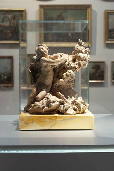 - NOTIZIE STORICO CRITICHE Il manufatto, che mette in scena un gruppo di angeli e cherubini vorticosamente intrecciati entro un inestricabile groviglio di piante, rocce e nuvole, presenta nella parte superiore un foro di alloggiamento per il candeliere.\nE' la sola terracotta riferibile con certezza al periodo veneto dello scultore genovese Filippo Parodi. Secondo F. Zeri, sarebbe il bozzetto preparatorio per il basamento di un candeliere realizzato dal Parodi per la Cappella dell'Arca nella basilica del Santo a Padova. Una serie di documenti, resi noti da G. Bresciani Alvarez (1964, p. 170), nei quali si menziona un primo pagamento all'artista il 24 febbraio 1689 e il saldo definitivo il 10 giugno dello stesso anno, consente di stabilire i termini cronologici della sua esecuzione nel corso del 1688 o, al più tardi, nei primissimi mesi dell'anno successivo ("Il conoscitore d'arte...", 1989, pp. 40-41). Per il gruppo di angeli e cherubini vorticosamente intrecciati Parodi guardò quasi certamente Gian Lorenzo Bernini, da lui ammirato a Roma, mentre per il modellato ariosamente pittorico si rifece alla pittura del Baciccio, anch'egli genovese e molto attivo a Roma.