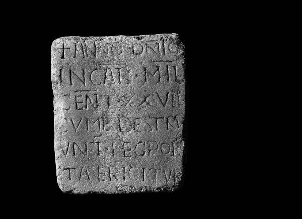 Lapide con iscrizione commemorativa proveniente da una porta di Como. Numerazione 476 con inchiostro nero sull¿angolo superiore a destra.\nI) ANNO DMIC\nINCAR MIL\nCENT XXVII\nCVME DEXTRV\n5) VNT HEC POR\nTA ERIGITUR