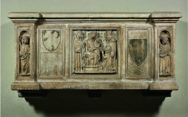 - NOTIZIE STORICO CRITICHE Sarcofago di Giovanni da Fagnano, marito di Confortina da Borsano, morto nel 1376.\n(Dall'oratorio di S. Matteo alle Banchette) in via Santa Maria Fulcorina.\nVedi Bollettino 1894; pag. 14 e segg. con fig. - Seletti n° 311, Forcella III\nAltezza 97 (III comprese le mensole);\nfianco 57 - 9 di fascia (60 I/2 con la fascia superiore e inferio. fronte 207.\nLatuada\nCC 3592 PE
