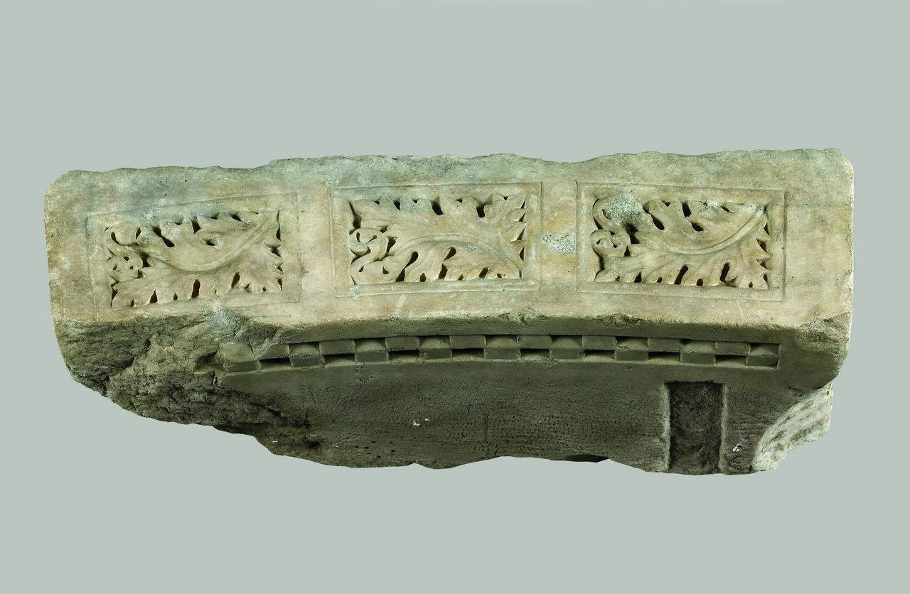 Parte di archivolto a tre segmenti con foglie sulla fronte; faccia sinistra con listello a dentelli