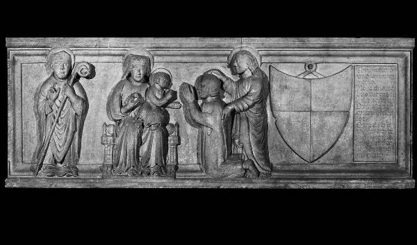 Fronte di sarcofago raffigurante la Madonna in trono col Bambino tra i Santi Agostino e Marco in atto di presentare il divoto , Mirano da Bechaloe; a destra stemma e iscrizione