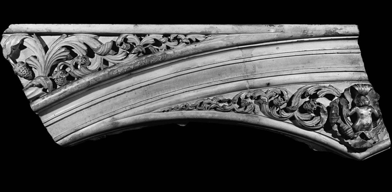 Frammento di archivolto suddiviso in fasce decorate con motivi vegetali (foglie e fiore di ??) e una sirena bicaudata