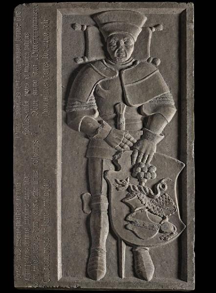 Lastra tombale raffigurante Antonello Arcimboldi in armatura. La mano destra regge una spada, la sinistra la targa araldica. Il bordo laterale sinistro è occupato da quattro righe dell'iscrizione