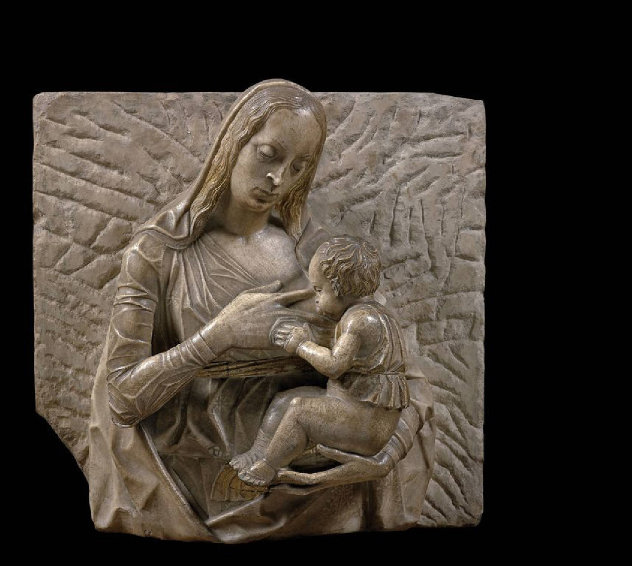 Lastra quadrangolare con Madonna a mezza figura che allatta il bambino, seduto in braccio a lei. Traccia di dorature.