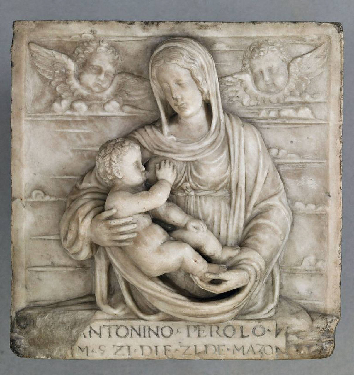 - NOTIZIE STORICO CRITICHE S.1231. Formella quadrata con figura della Vergine a 2/3 di figura che regge il bambino poppante. Sul fondo due angeli e nuvole.\nScritta sulla base-mutila Ant.Perolo.M5Z1 [1521] DIE ZI DE MAZO\nN.954.