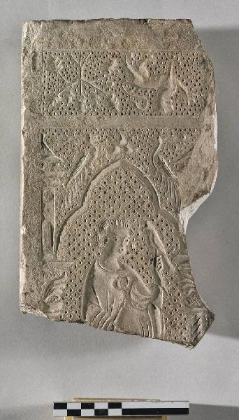 Il frammento rappresenta un cavaliere che regge un falcone entro un'edicola archilobata sorretta da colonne; sopra a quella di sinistra, struttura architettonica; sullo sfondo due uccelli disposti simmetricamente. Al di sopra fascia decorata da un tralcio vegetale (ghianda?) e quadrupede. Le due scene presentano una decorazione a punti, organizzati entro losanghe nella parte circoscritta dall'edicola. La lavorazione in cavo suggerisce l'uso del manufatto come matrice