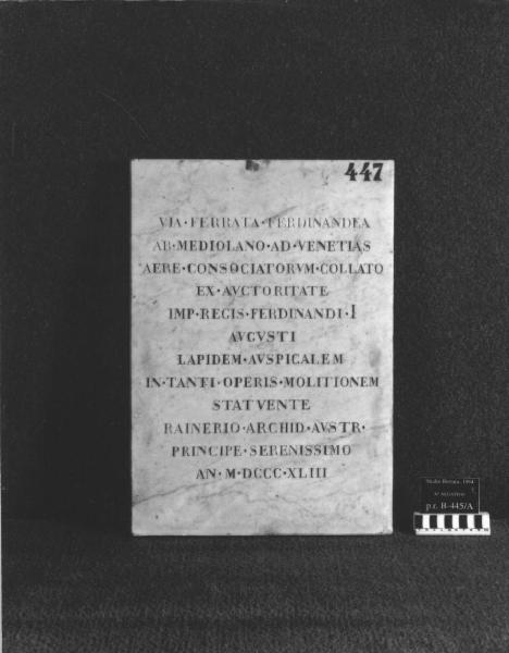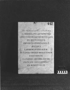 Targa ettangolare con iscrizione relativa all'inizio dei lavori di costruzione della ferrovia Milano- Venezia, promossa dall'imperatore Ferdinando I. Targa voluta dall'arciduca Ranieri. Per il testo, voluto da Alessandro Merone De Benvenuti, scritto in inchiostro sul verso si veda Seletti. Il verso, manoscritto, è andato perduto.