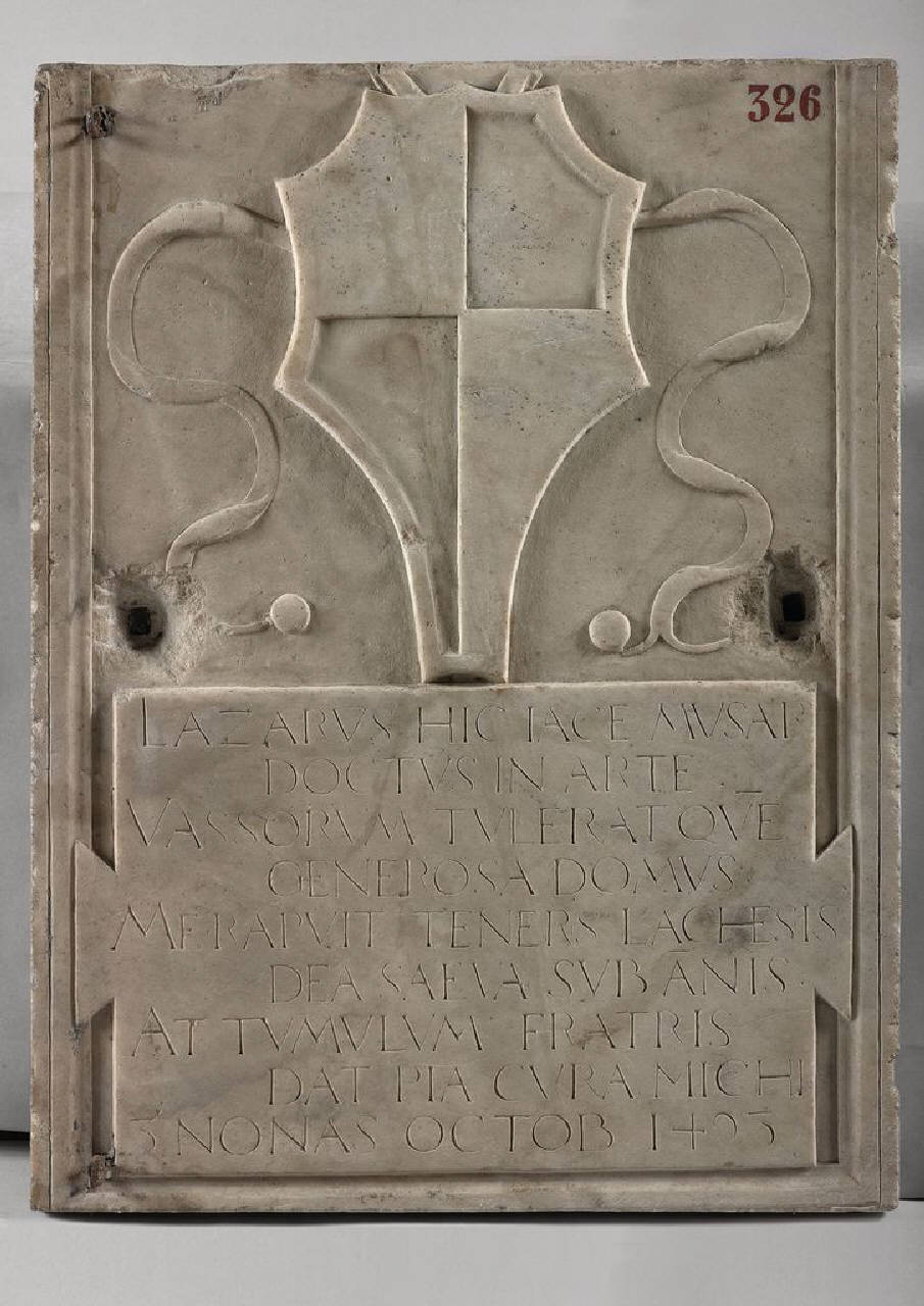 Lastra tombale ornata in alto da uno scudo a testa di cavallo e in basso da targa ansata con iscrizione funeraria in versi dedicata a Lazzaro probabilmente dal fratello. Lato posteriore: iscrizione funeraria a Maria Crucifissa Anguissola (S. 0326 bis Seletti)