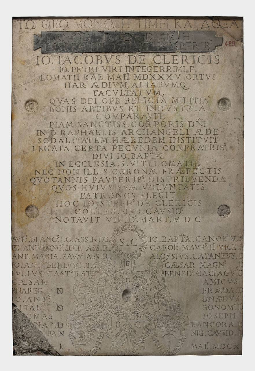 Lastra rettangolare opistografa con sul verso le disposizioni testamentarie di Gian Giacomo Clerici a favore delle Confraternite di San Giovanni Battista di Lomazzo, della Santa Corona, del Corpus Domini et alia. Presenza di stemmi delle famiglie: Clerici di Camnago, Perini di Bresso e Lomazzi? La lastra è immorsata in una cornice bronzea, con ganci che forse ne permettevano la visione a bandiera.